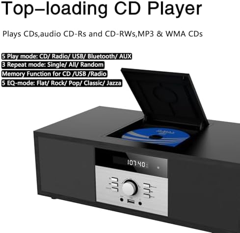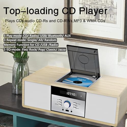 Enjoy your favorite CDs, CD-R/RW, MP3 CDs, and audiobook CDs effortlessly. Our top-loading CD player features three repeat modes (one, all, or random) and five EQ settings (flat, classic, rock, pop, and jazz) to enhance your listening experience.